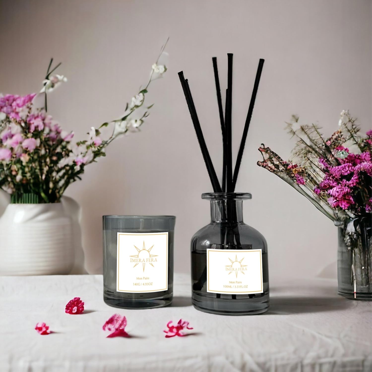 Choose simple containers that match your decor so they feel intentional rather than cluttered. This small addition is inexpensive but makes evenings feel noticeably more cozy. Similar candles and diffusers are easy to find online at different price points.