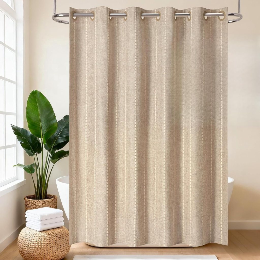 A neutral shower curtain in white, cream, or soft beige opens the space up and reflects more light. Linen-look or textured fabric styles feel especially elevated and give off that hotel-bathroom vibe.