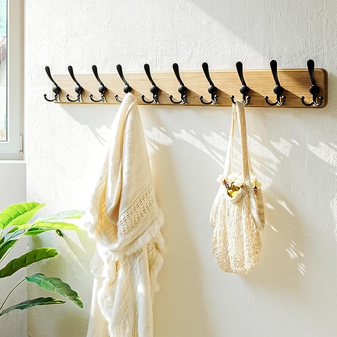 Opt for matte black, brushed brass, or wood-accented hooks. Even spacing and alignment make a big difference here. When hooks are lined up cleanly, they feel intentional instead of temporary.